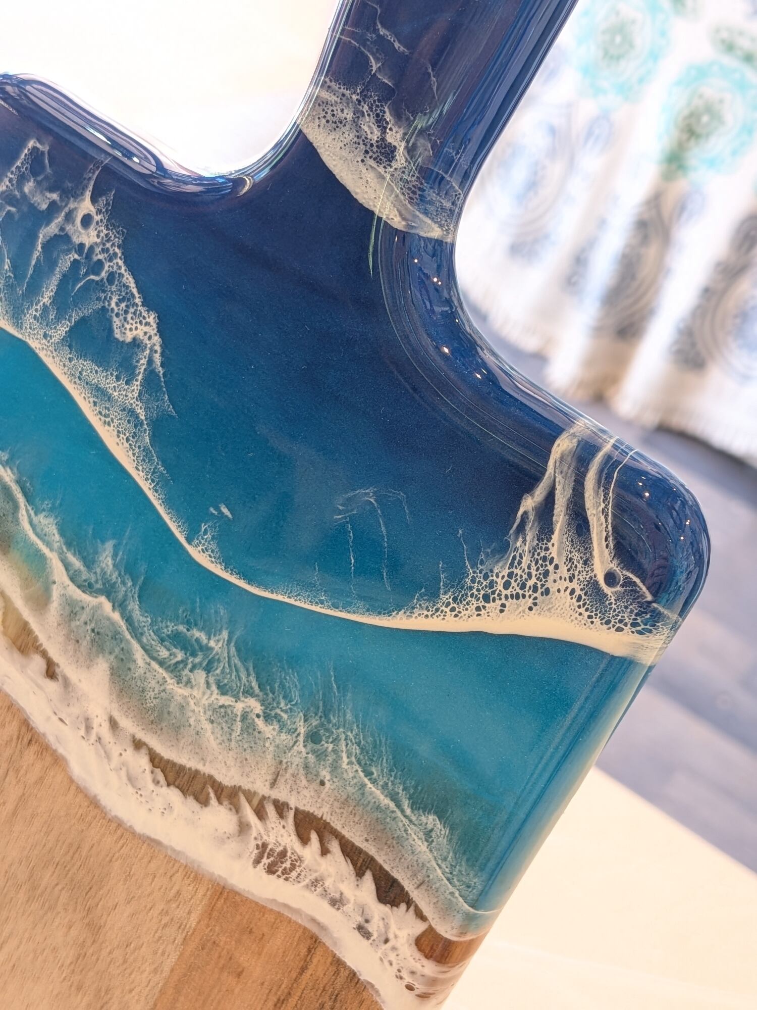 手作りのこのカッティングボードは、各々異なる模様を持ち、あなたの料理に特別なエッセンスを添えます。贈り物としても喜ばれること間違いなし!ぜひ、エメラルドとブルーの美しい色合いを感じながら、楽しい料理のひとときをお楽しみください。