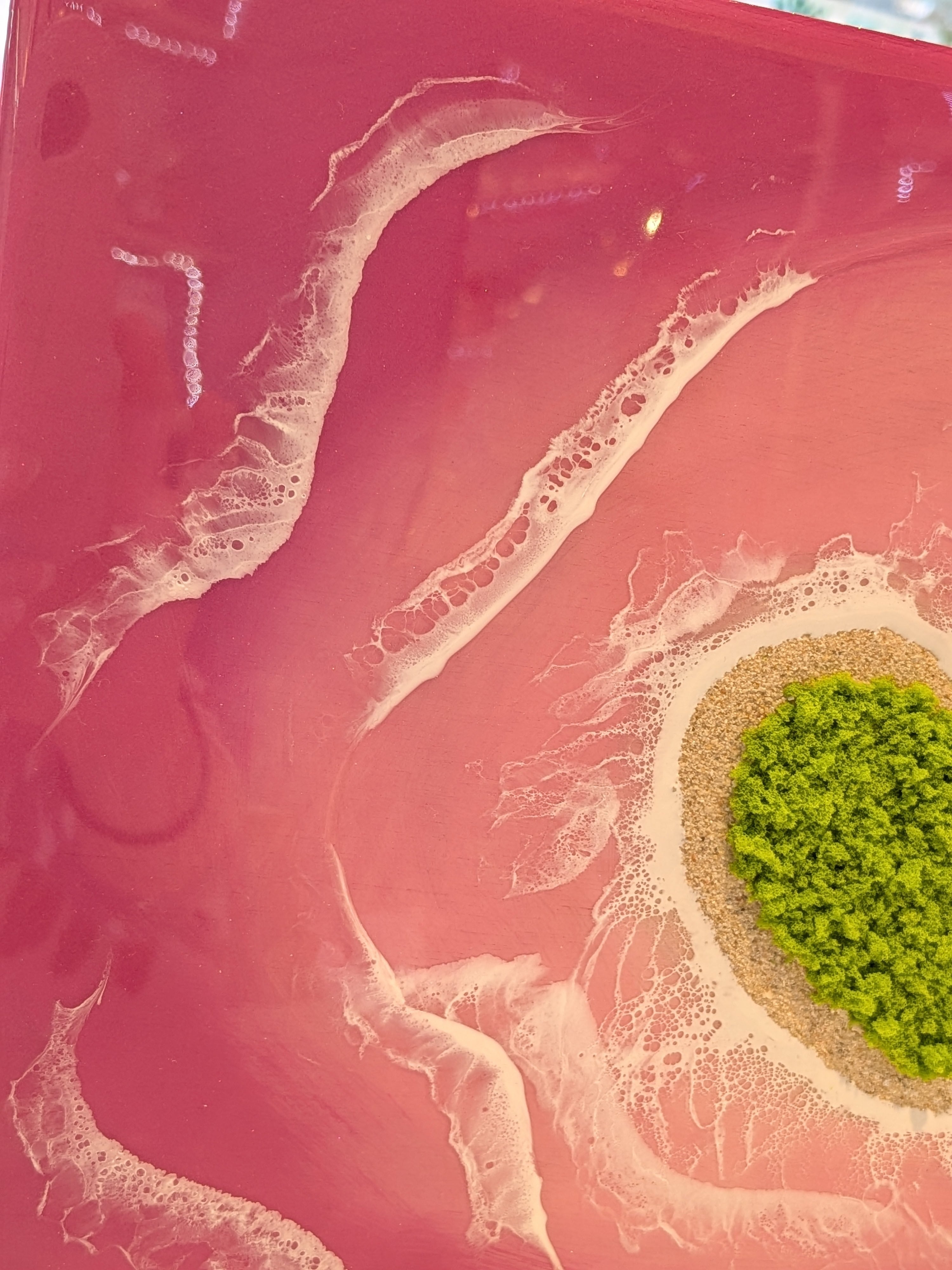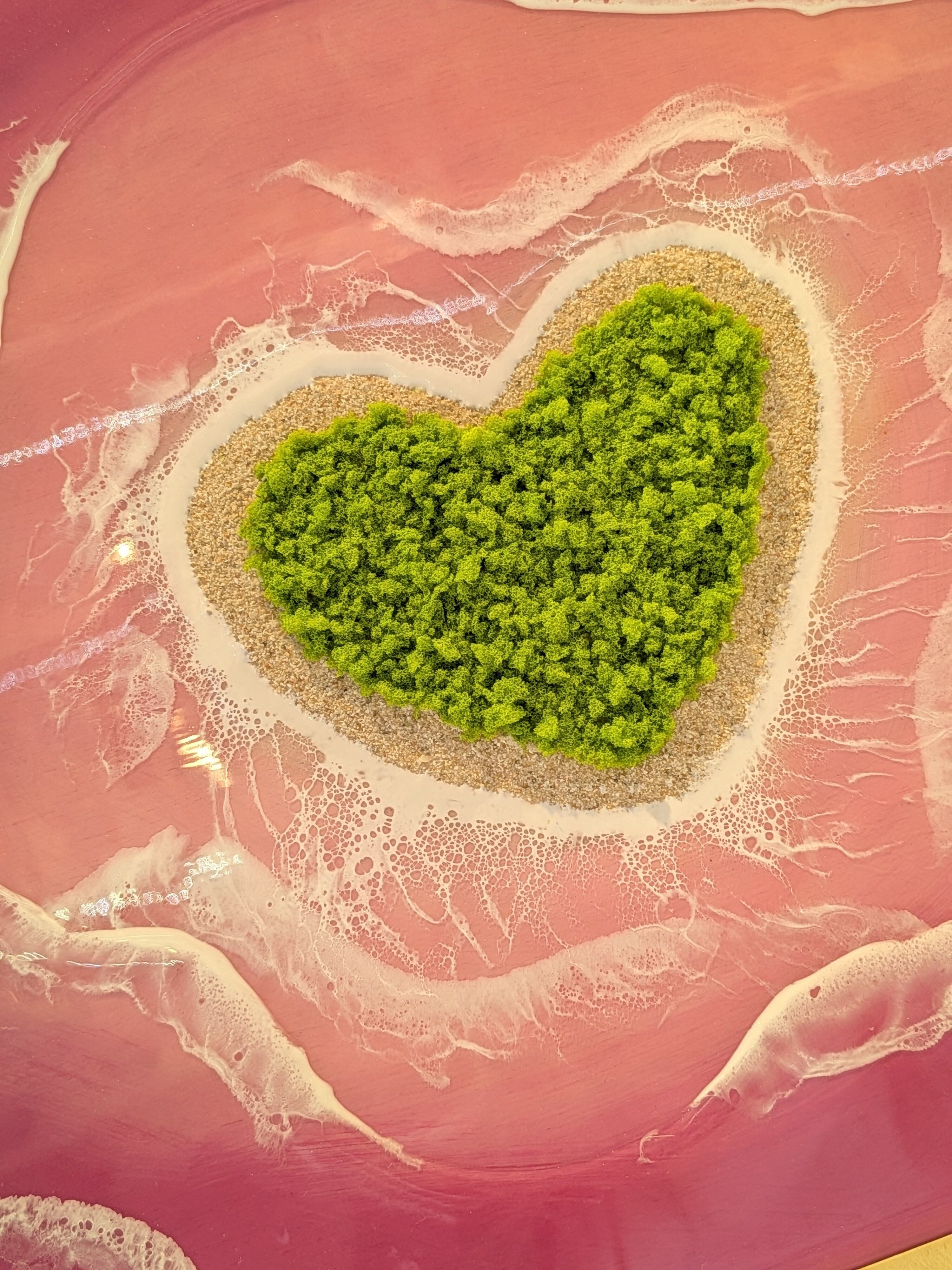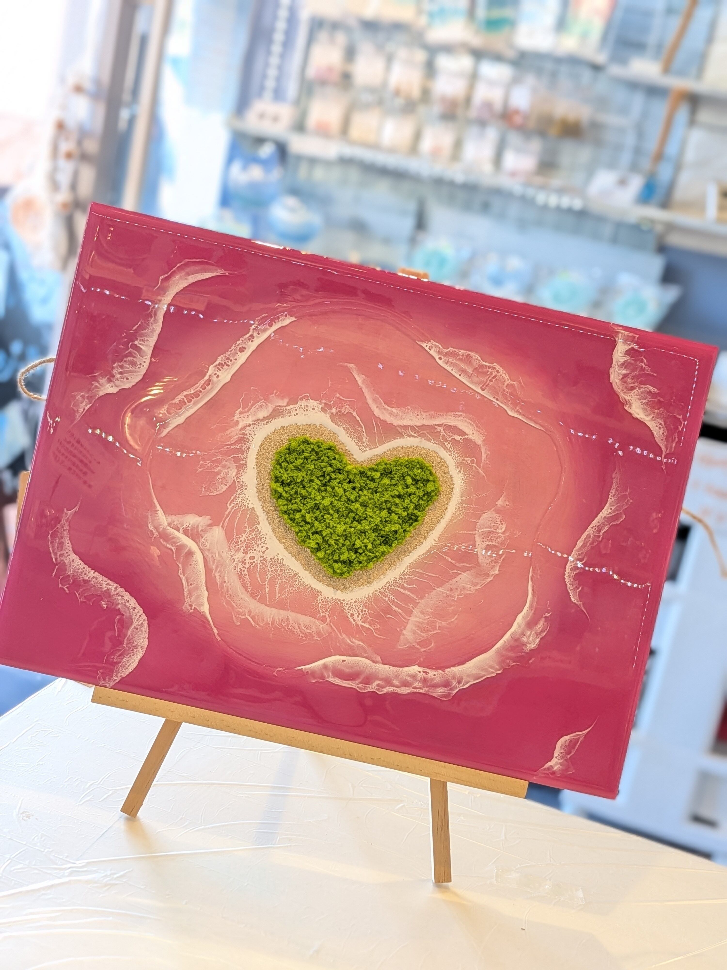 こちらはピンクの海にハート型の砂浜にグリーンをあしらった温かみのあるF4パネルです。美しい砂浜の風景と調和し、心を落ち着かせるような癒しの空間を演出します。このレジンアートは、インテリアとしても魅力的で、リビングや寝室、オフィスなど、どんな場所にもぴったりです。