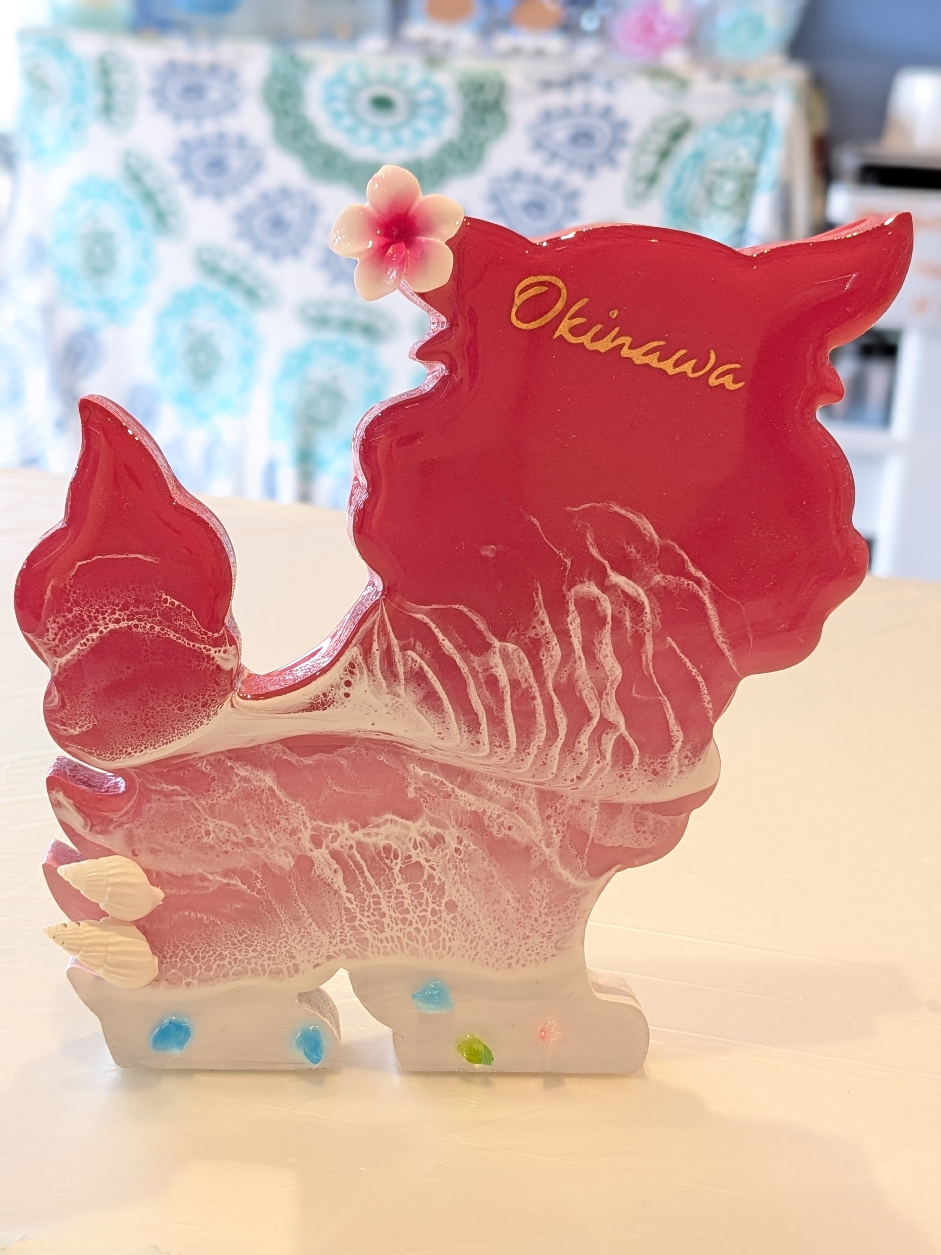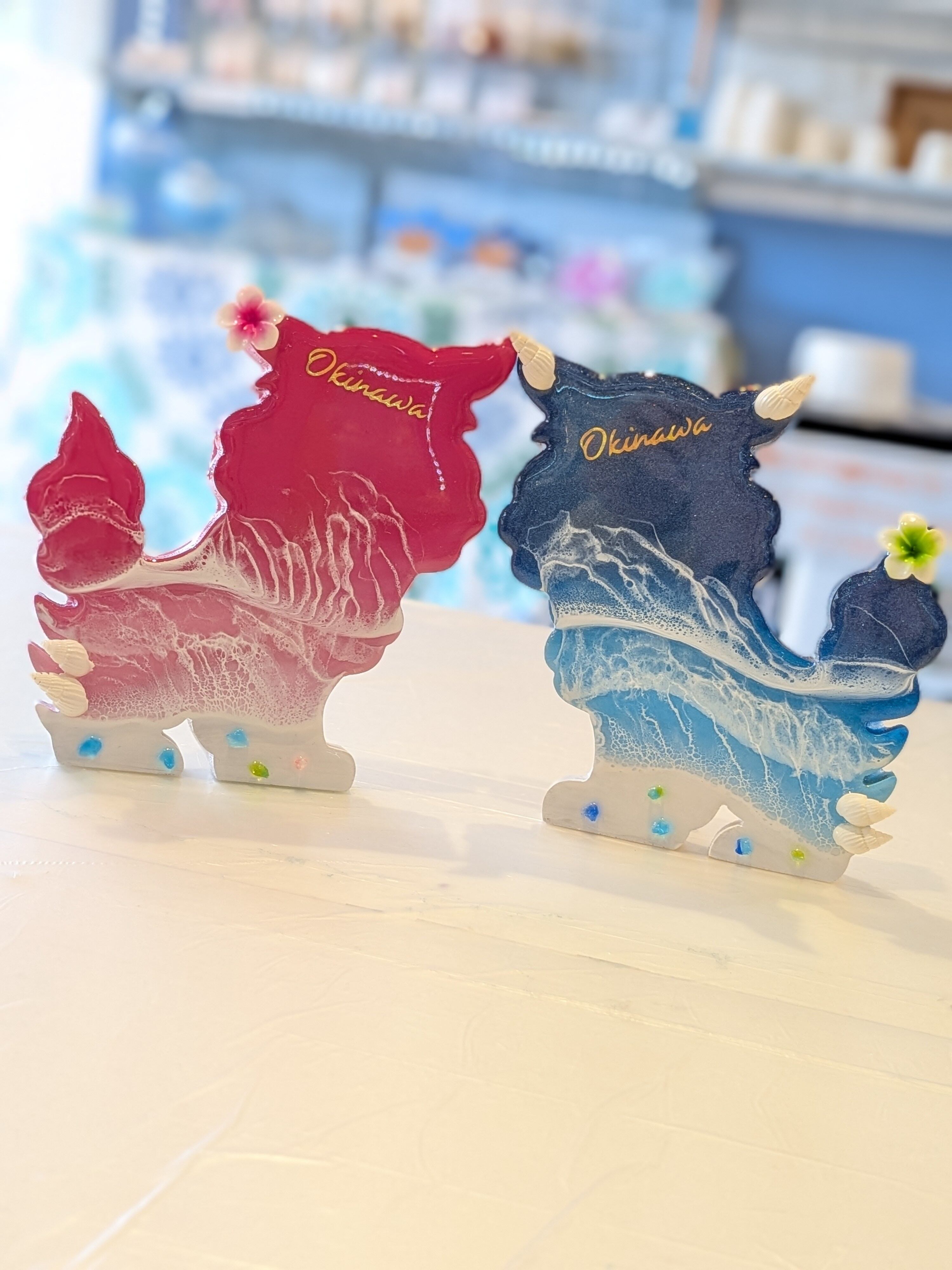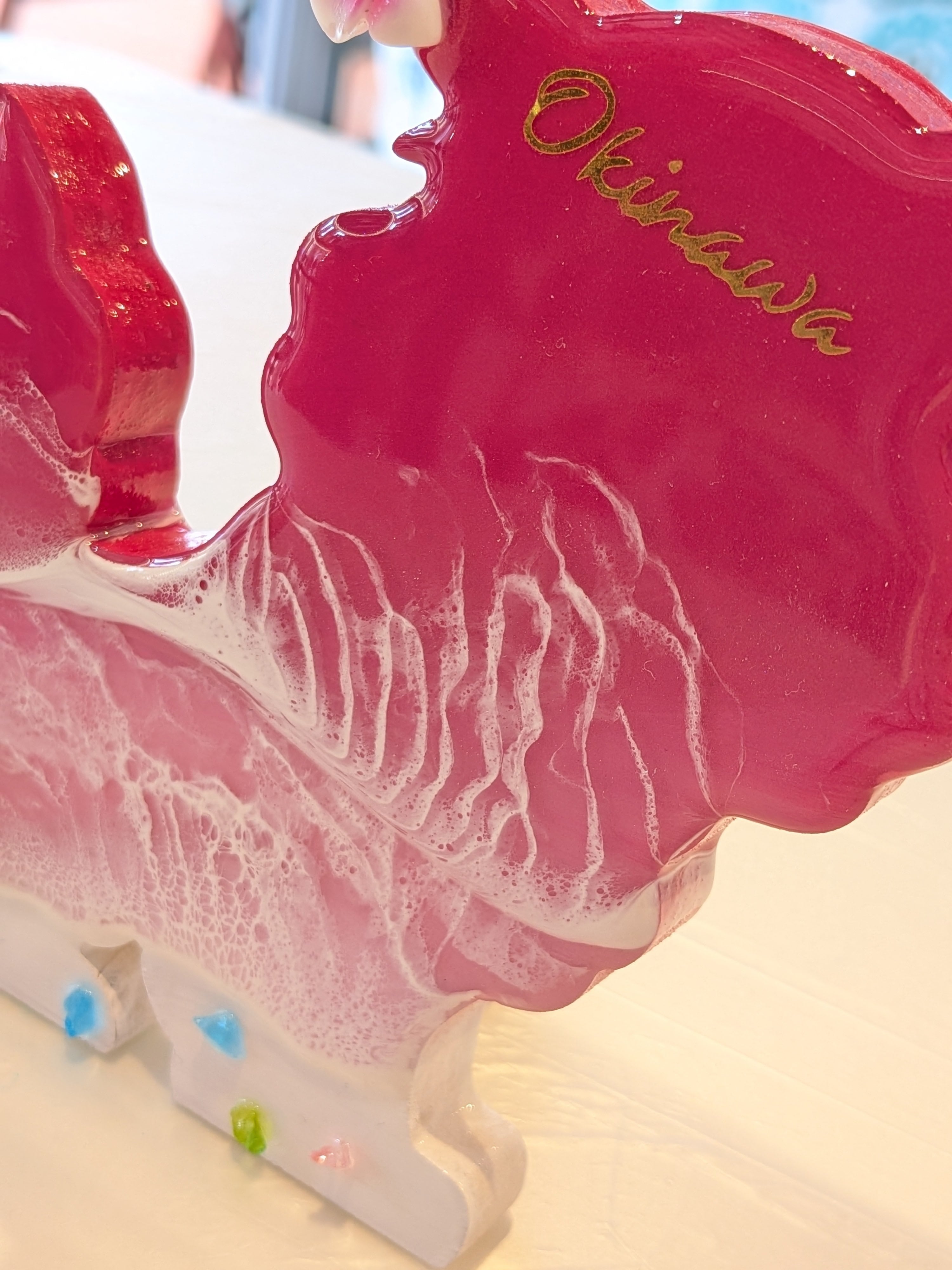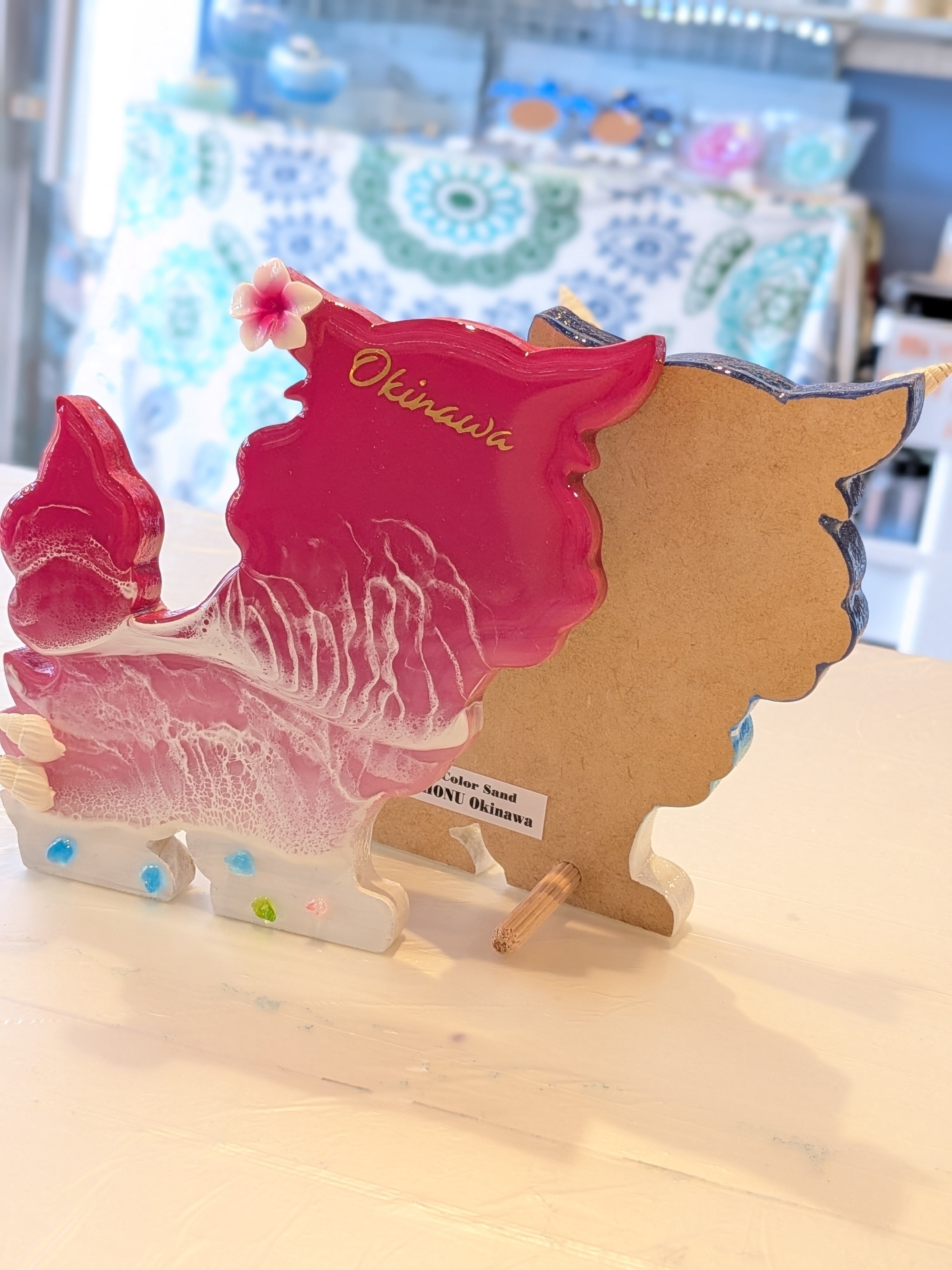 こちらは、優雅なパステルピンクとピンクのグラデーションが魅力的なミニシーサーのレジンアートです。見る人の心を明るくし、空間に幸せを運ぶ存在感があります。このシーサーをお部屋に迎えることで、心地よい安らぎを感じられることでしょう。