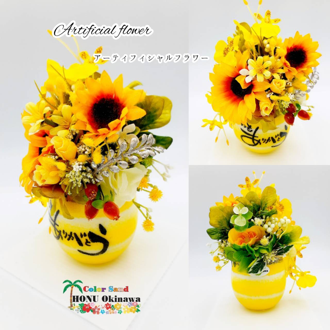 上部はアーティフィシャルフラワー(造花)で仕上げ、一つ一つ心を込めて丁寧にカラーサンド(色砂)でお作りしてます。