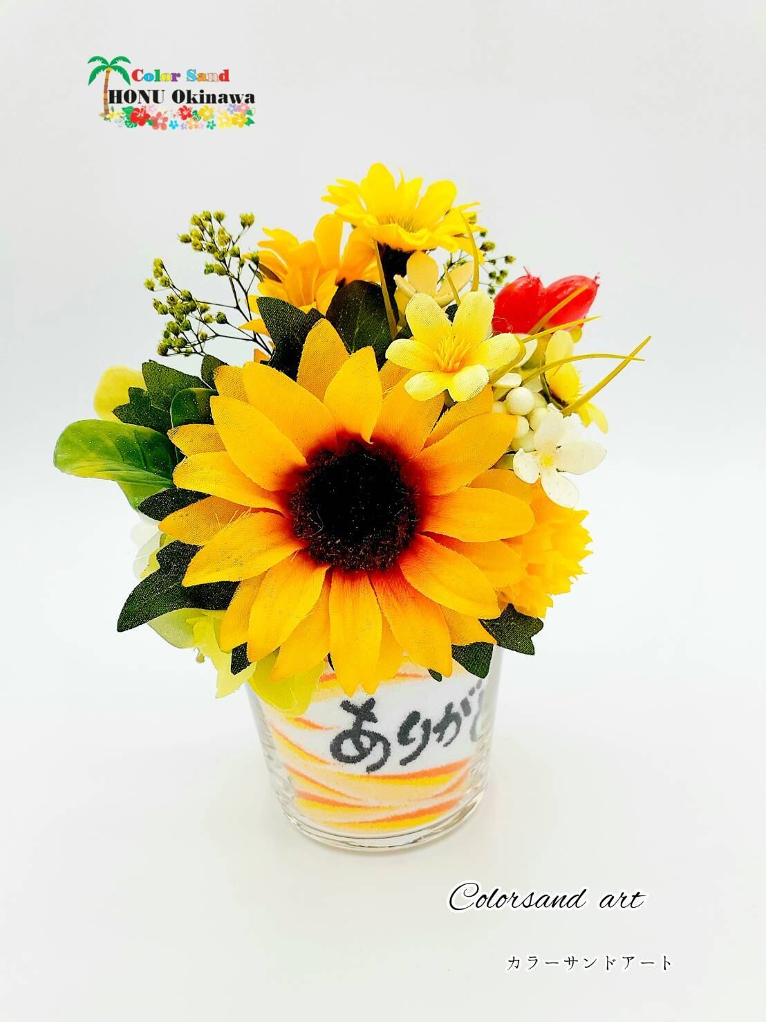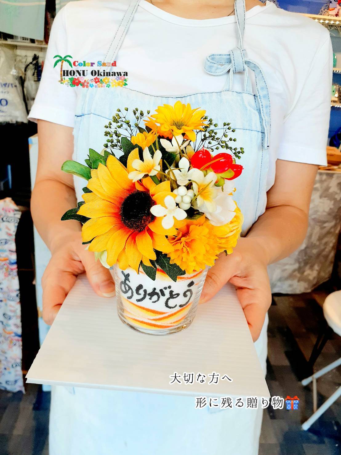 上部はアーティフィシャルフラワー(造花)で仕上げ、一つ一つ心を込めて丁寧にカラーサンド(色砂)でお作りしてます。