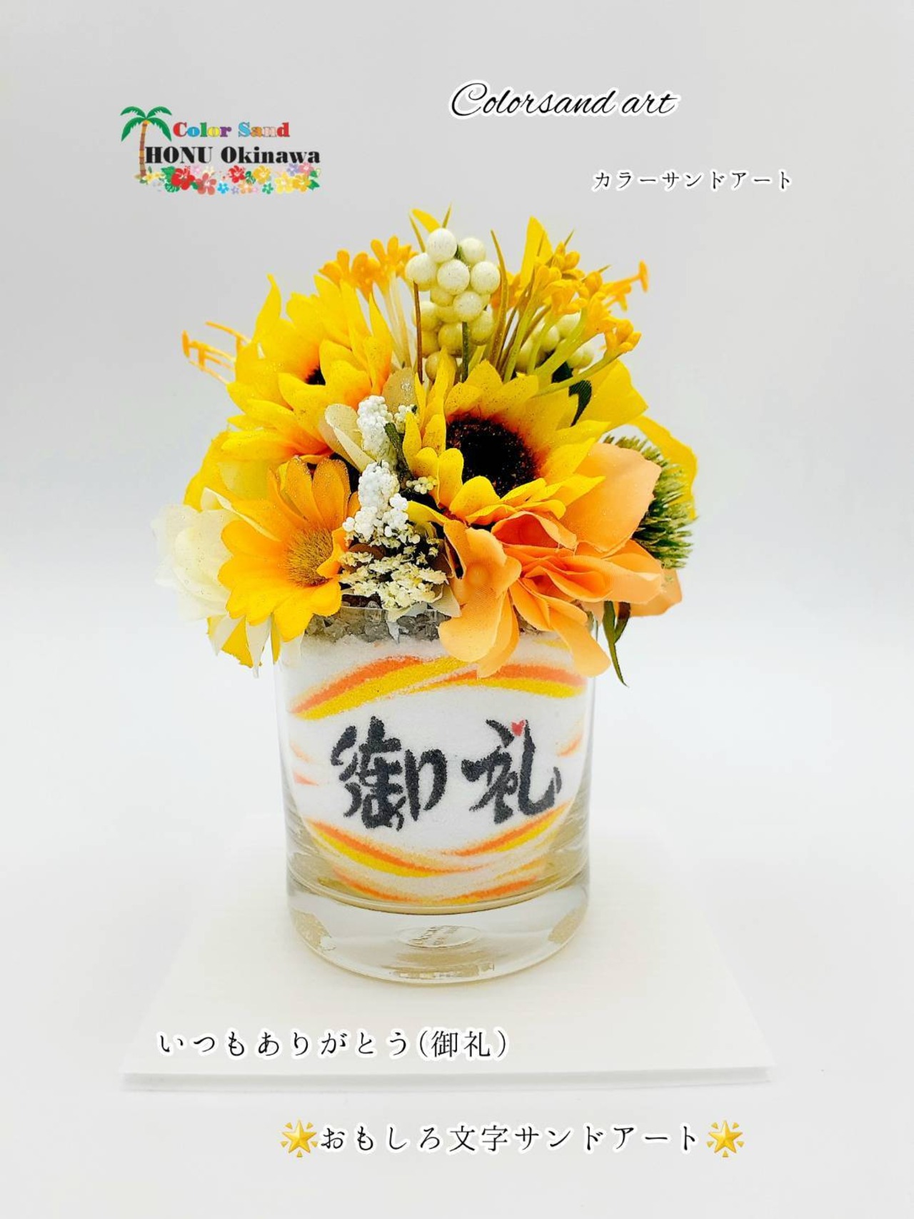 御礼』カラーサンドアートは、おもしろ文字が特徴のアート作品です。