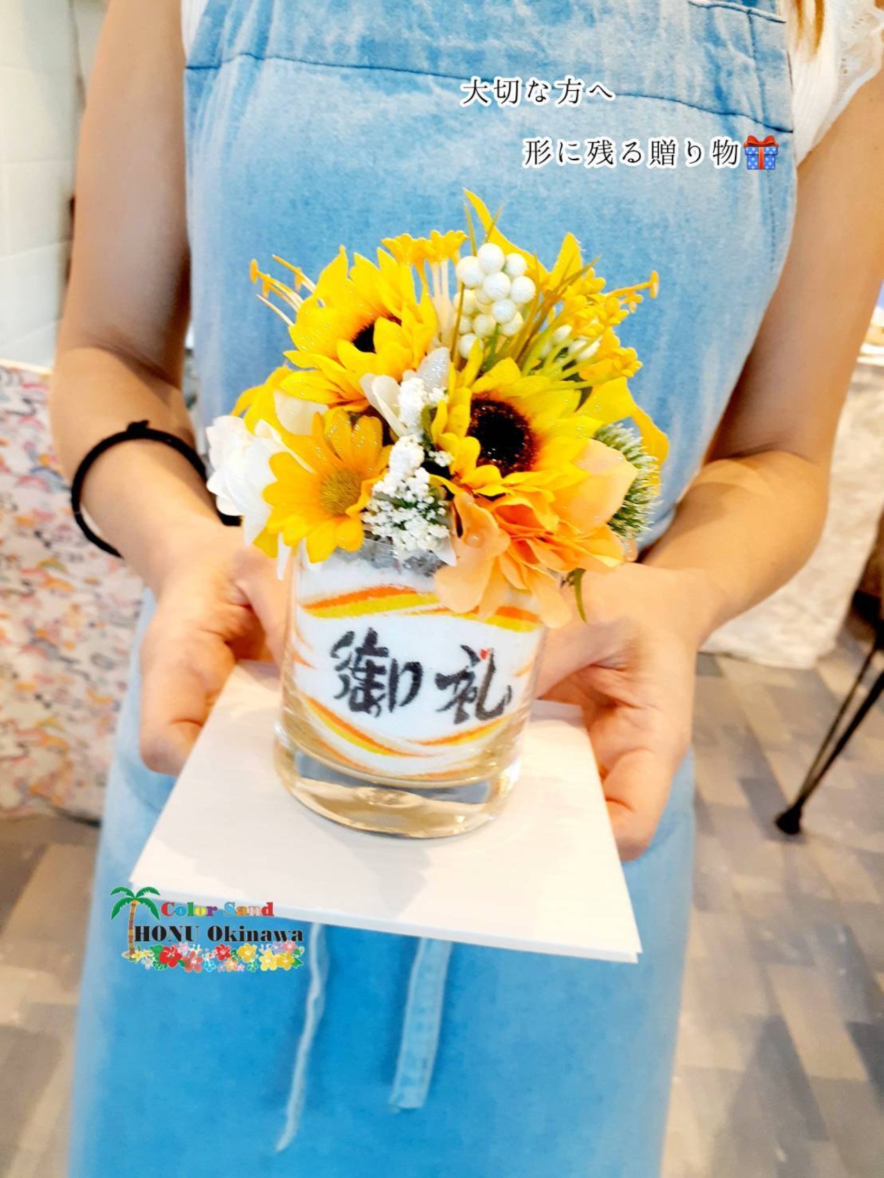 上部はアーティフィシャルフラワー(造花)で仕上げ、一つ一つ心を込めて丁寧にカラーサンドでお作りしてます。