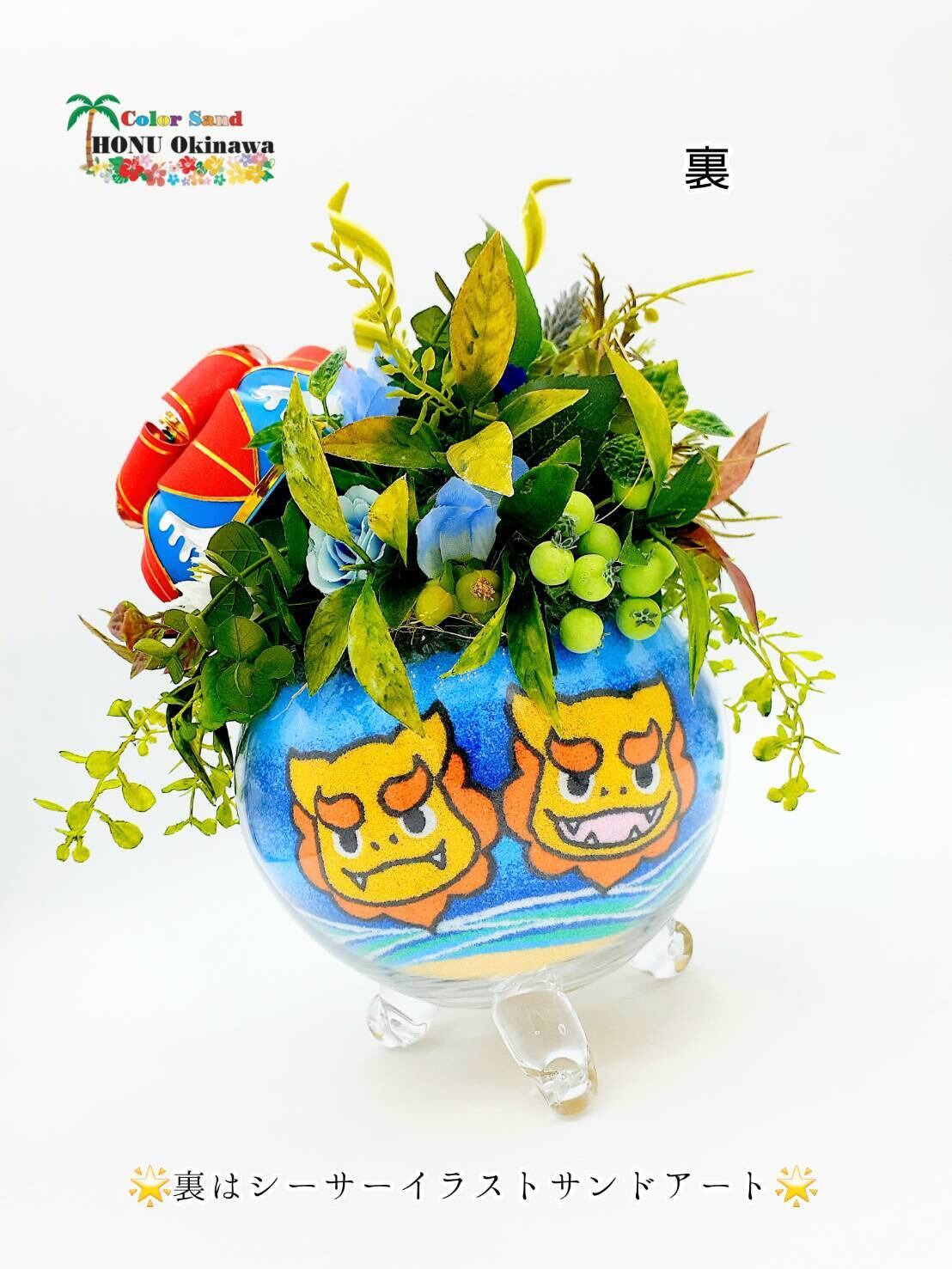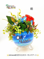 こちらは前の方には沖縄を象徴するシーサーのイラストが描かれ、後ろの方には『OKINAWA』の文字が入っており、どちら側からも楽しめる作品となってます。砂を重ねることによって、細やかで独特な模様を作り出しています。