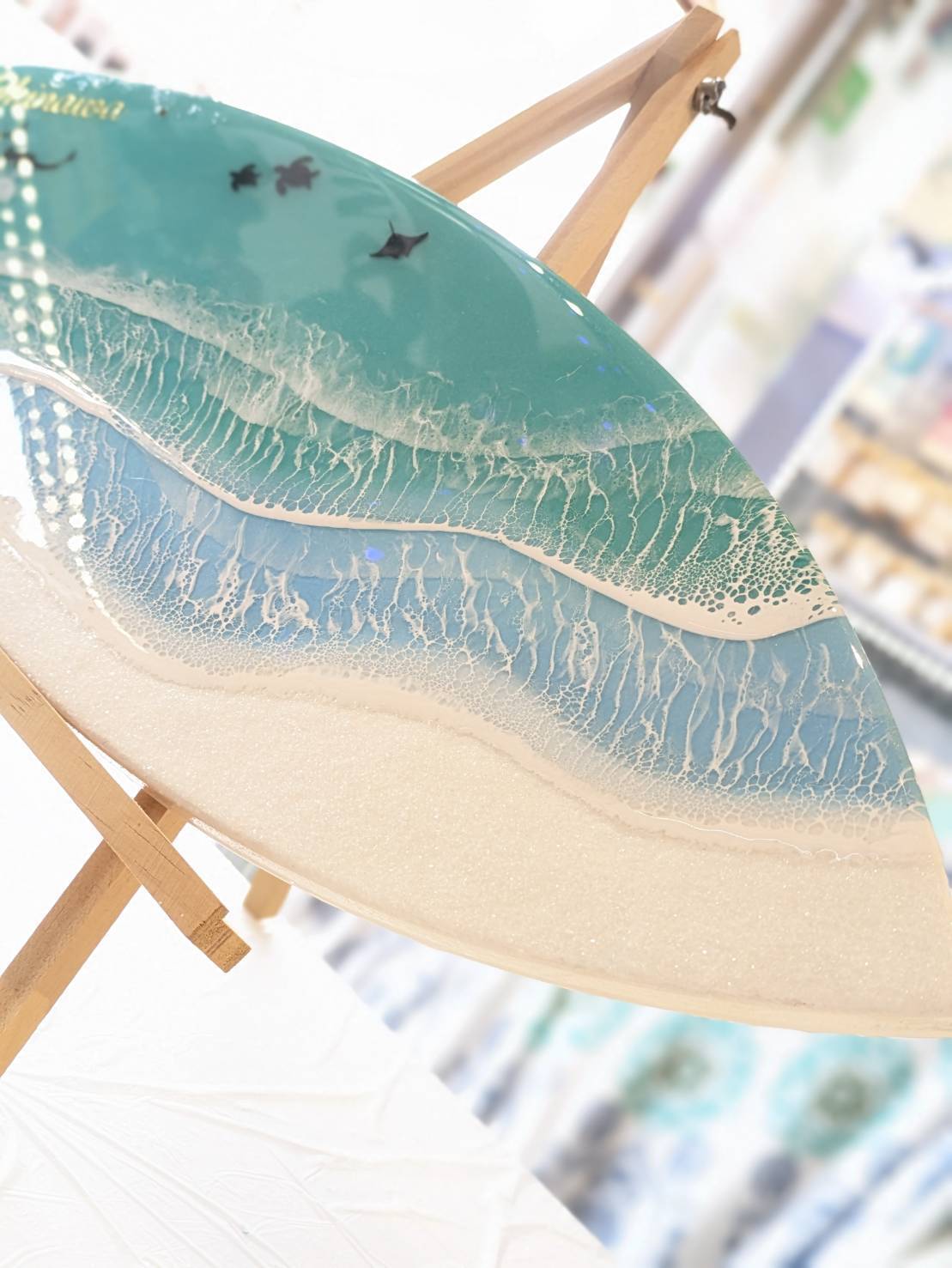 波のリズムが描く美しい色合いは、まるで彩雲が舞い降りているかのよう。実際にサーフィンをする方や、海が好きな方にぴったりのアート作品として、お部屋のインテリアにも相応しい逸品です。日々の暮らしに彩りを加える、Okinawaの海辺から愛を込めて贈ります。このサーフボードがあなたを、海の底から明るい世界へ誘いますように。