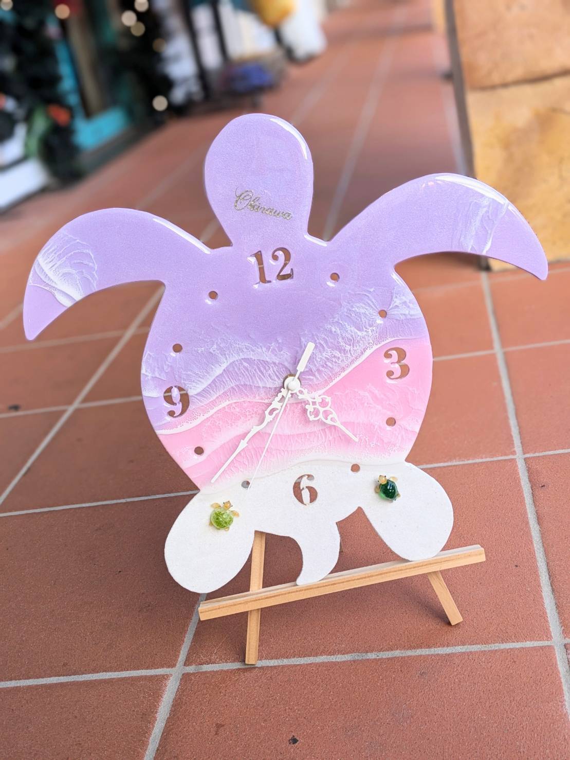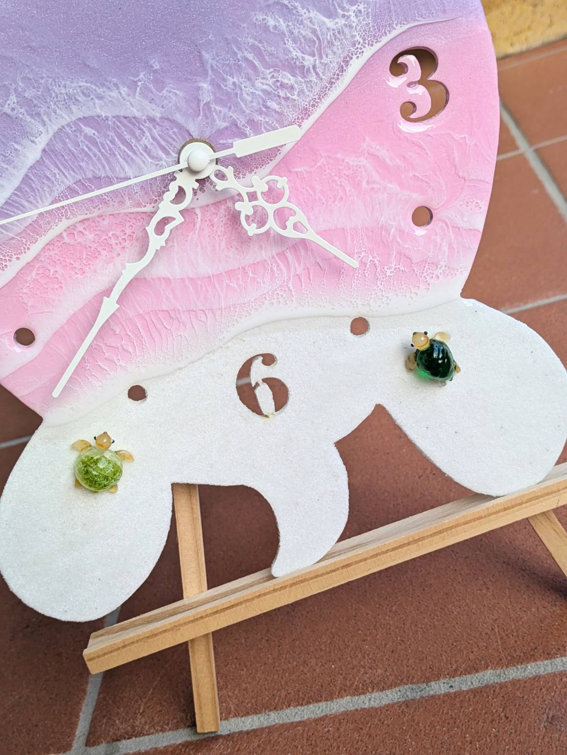 こちらは優しいパステルピンクとラベンダーが織りなす、ウミガメをモチーフとした美しい時計です。お部屋に海の穏やかな雰囲気をもたらし、リラックスした空間演出にぴったりなアイテムとなっています。手作りのアート作品ならではの奥深い色合いや、魅力的な表情が特長です。